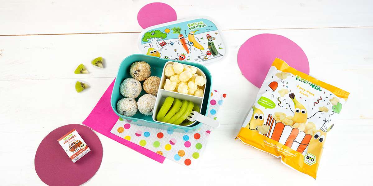 Das steckt drin: Mandel-Kokos Bällchen, Kiwi und das Freche Freunde Popcorn.