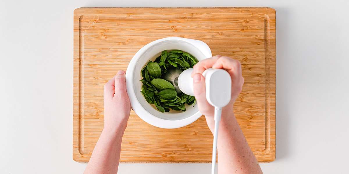 Zuerst den gewaschenen Spinat mit einem Pürierstab zerkleinern.