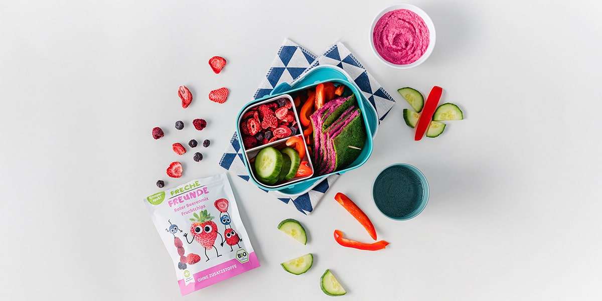 Nutze die Fächer oder Trenner der Freche Freunde Brotdose, damit die Pfannkuchen nicht mit Gemüse oder Fruchtchips durcheinanderkommt. So bleibt alles knackig und frisch.