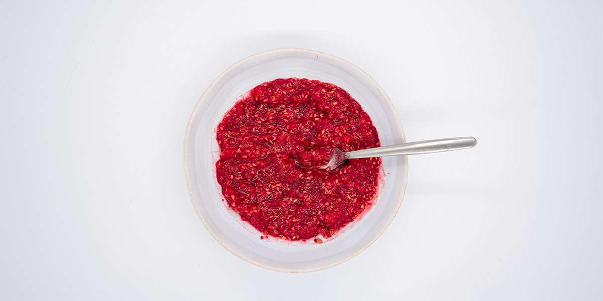 Himbeeren in eine Schüssel geben und mit einem Kartoffelstampfer oder einer Gabel klein stampfen.