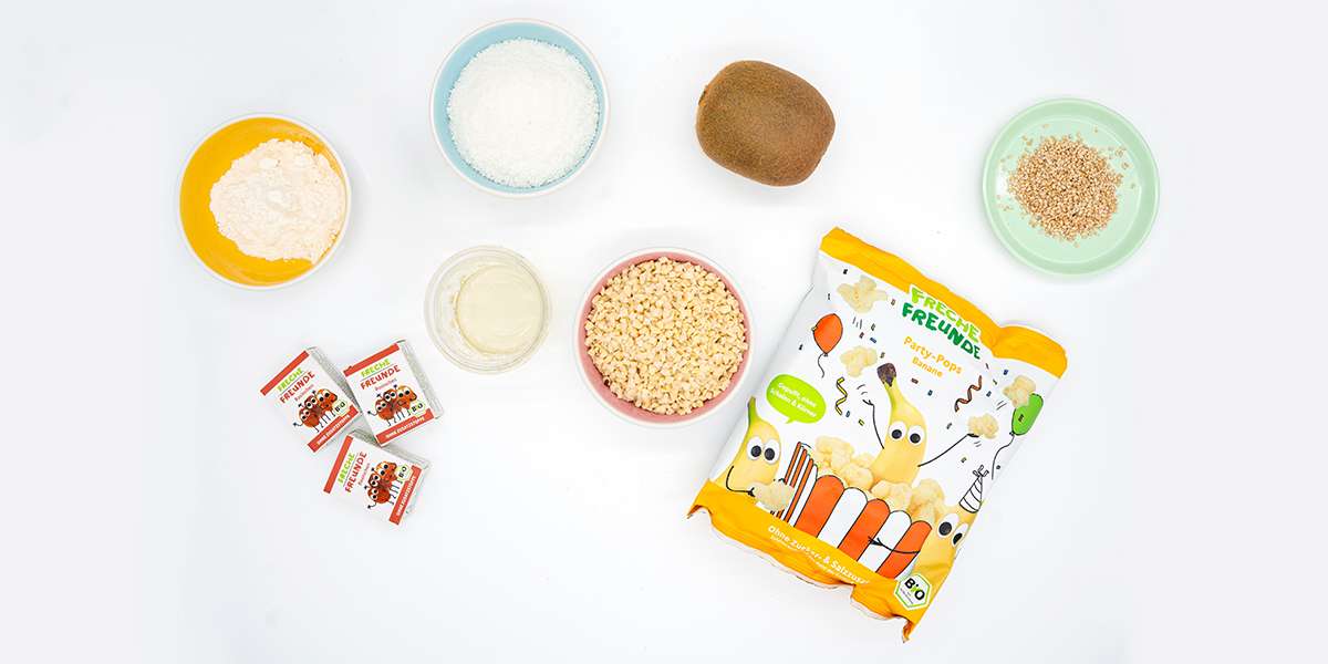 Für die Brotdose: die Kiwi schälen, in Scheiben schneiden und in das Bento-Einsatz Schälchen packen. Freche Freunde Party Pops in das andere Bento Fach und die Bällchen in das große Fach.