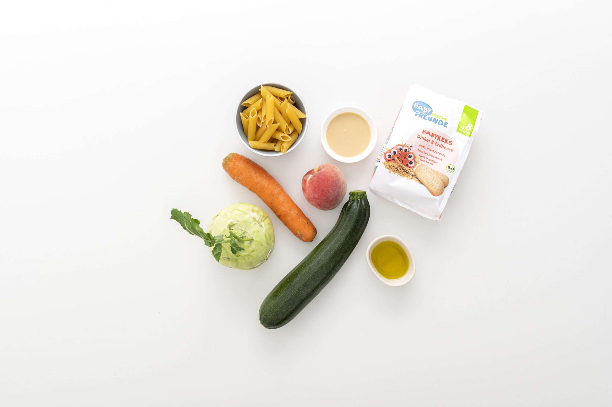 Unser Nudelsalat BLW-Style ist super einfach gemacht: Weiche Penne, buntes Ofengemüse und ein Klecks Mandelmus sorgen für die Extraportion Zink, Kalzium, Eisen und Kalium – wichtig für kleine Wachslinge! Und on top gibt’s Pfirsich-Spalten und einen Freche Freunde Babykeks Dinkel & Erdbeere zum fröhlich Knuspern.