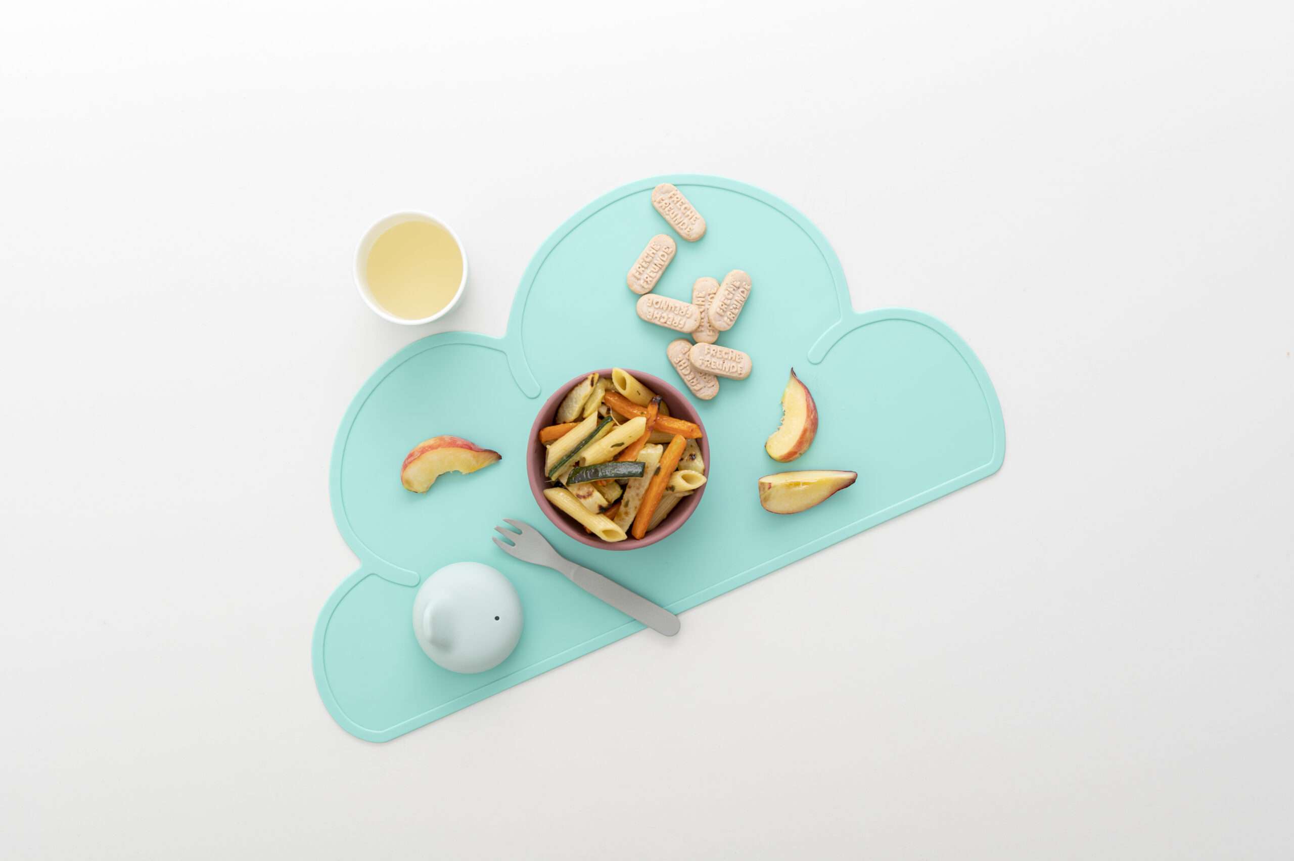 Den Teller mit dem Nudelsalat, den Pfirsichspalten und ein paar Babykeksen Dinkel & Erdbeere anrichten – und dein kleiner Knabber-Freund kann fröhlich loslegen!