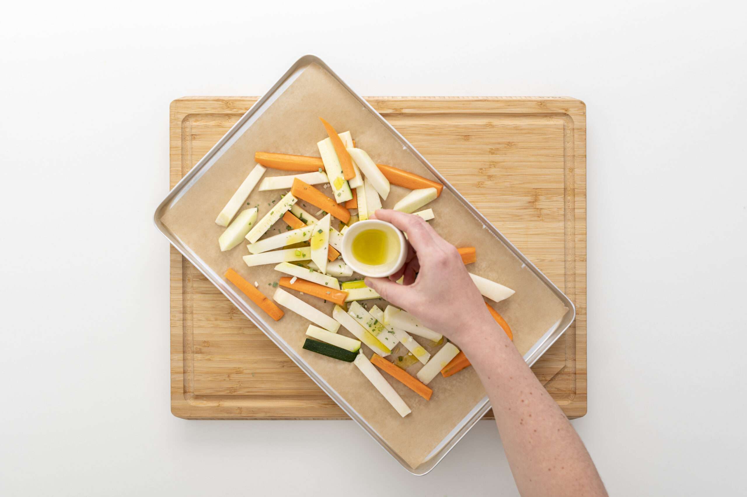 Möhre, Zucchini und Kohlrabi waschen, schälen (wenn nötig) und in 5 cm lange, 1 cm dicke Spalten schneiden – perfekt fürs kleine Greifen!