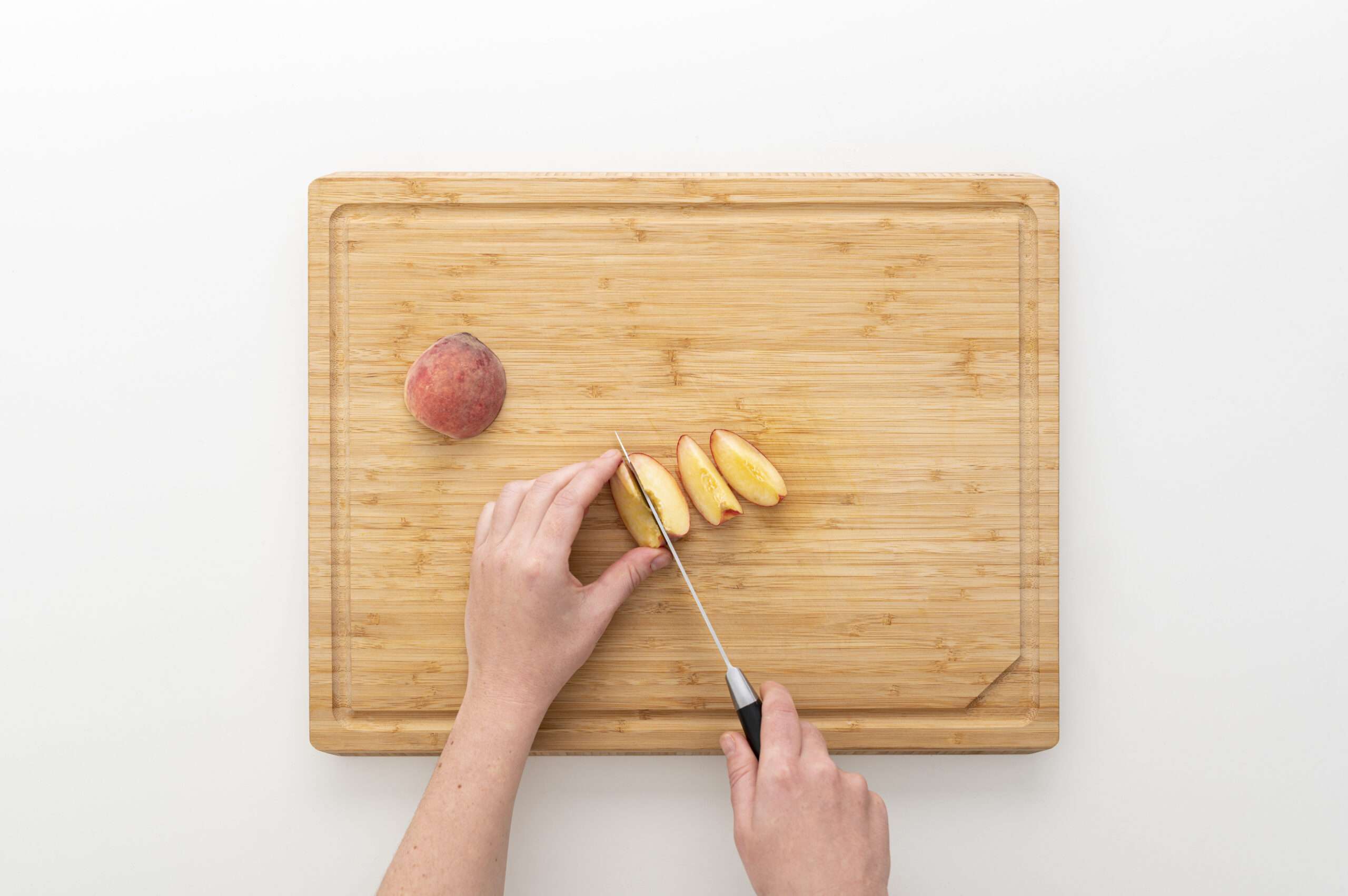 Den Pfirsich waschen, halbieren, entkernen und in 1 cm breite Spalten schneiden.