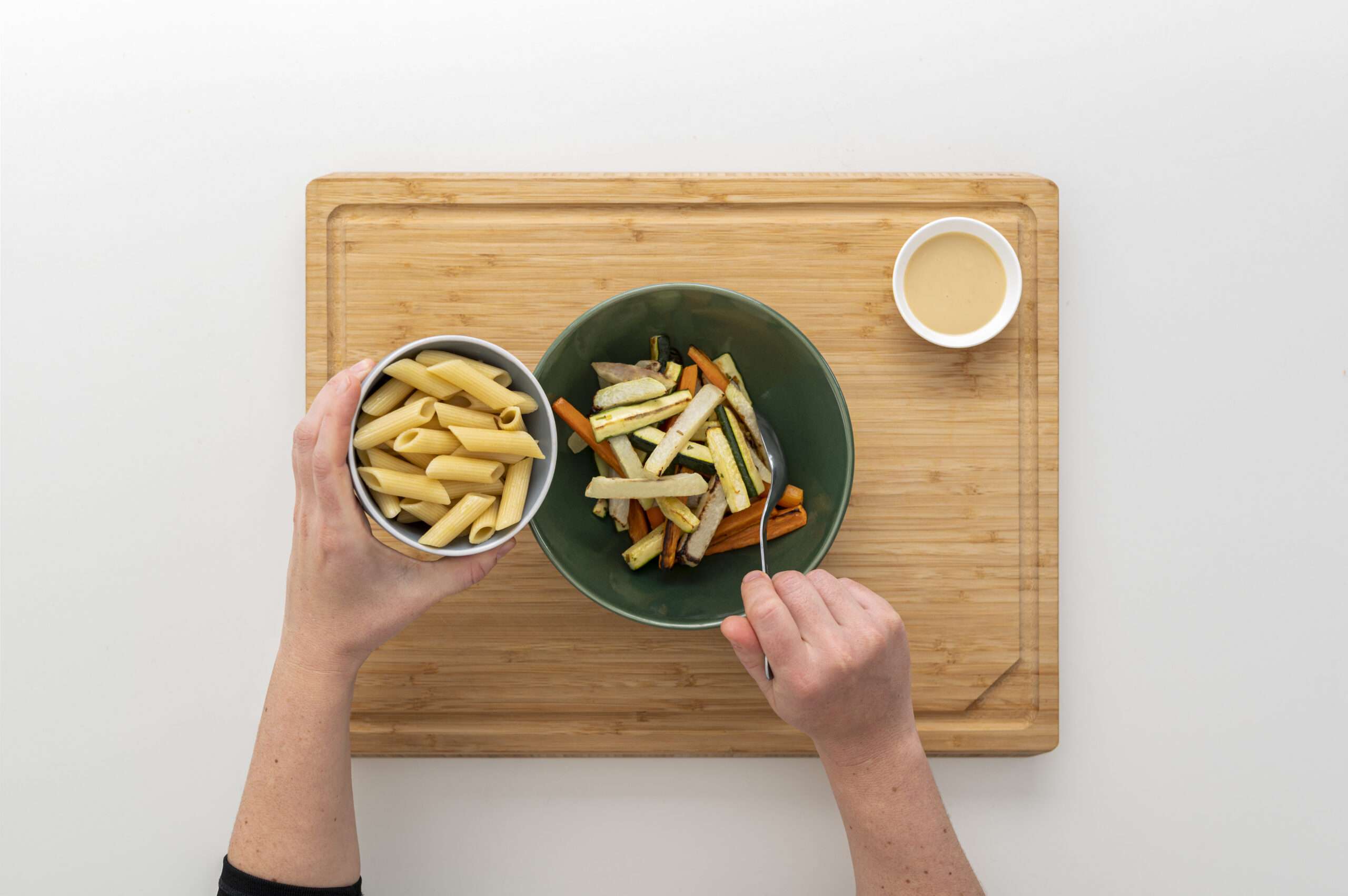 Nudeln, Ofengemüse und 1 EL Mandelmus vorsichtig vermengen. Du kannst noch 1 EL Olivenöl dazugeben, wenn du magst – das macht’s schön cremig.