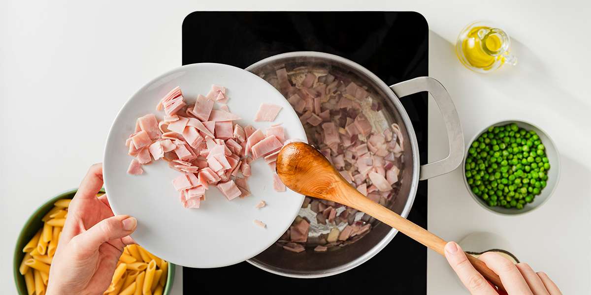 Das Olivenöl in einem großen Topf erhitzen. Die Zwiebeln und den gewürfelten Kochschinken darin für 2–3 Minuten anbraten, bis beides leicht gebräunt ist.